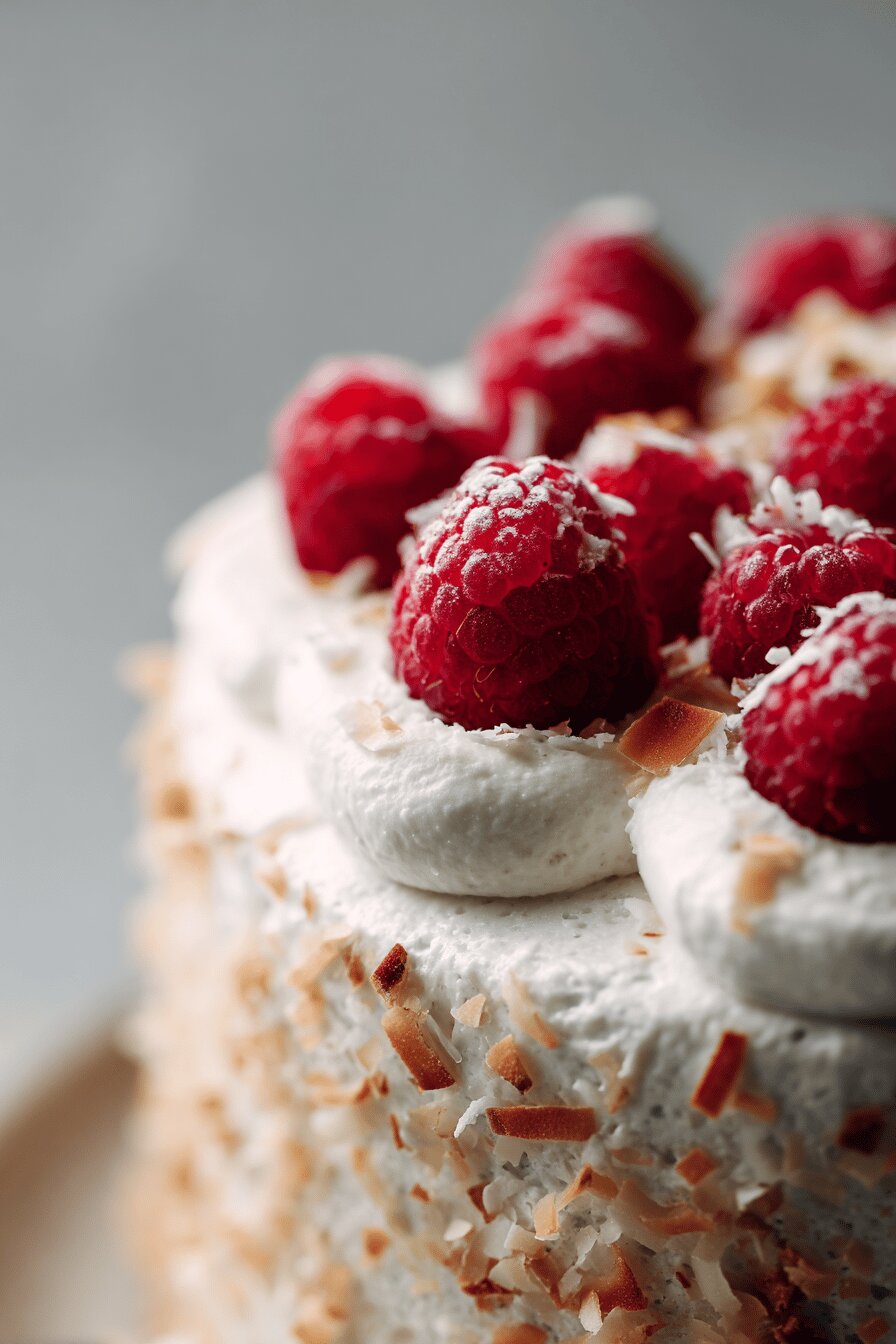 - Spread whipped cream evenly over cooled cake. Scatter fresh raspberries on top. For added texture and flavor, sprinkle toasted coconut flakes over berries—adds a nutty crunch and visual contrast.