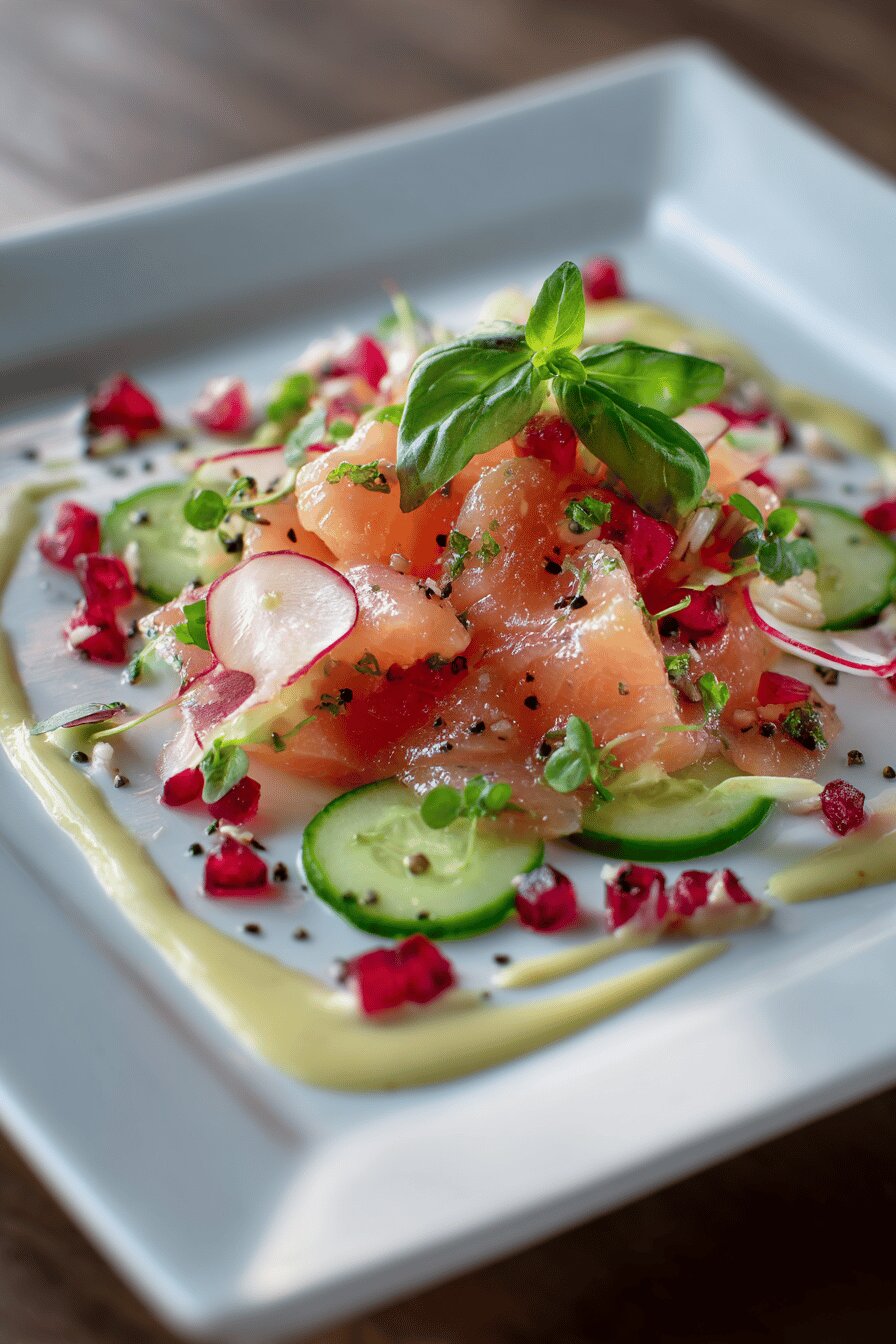 A minimalist crudo using trout cured briefly in salt and brown sugar. Cranberries blaze in a sharp cider vinegar vinegar emulsion sweetened with maple syrup. Puffed wild rice adds crunch and smoky nutty notes. Thin slices of cucumber and radish bring crispness and freshness. Basil leaves for a fresh herbal touch. Creamy tang from sour cream mingles with a grainy mustard dressing. Techniques focus on razor-thin slicing, proper curing rinse, and safe hot oil handling to puff rice quickly. Balance textures: silky fish, crispy puffed grains, creamy dressing, crunchy vegetables. A dish for cool evenings or light starters, gluten, dairy, egg free adaptable.