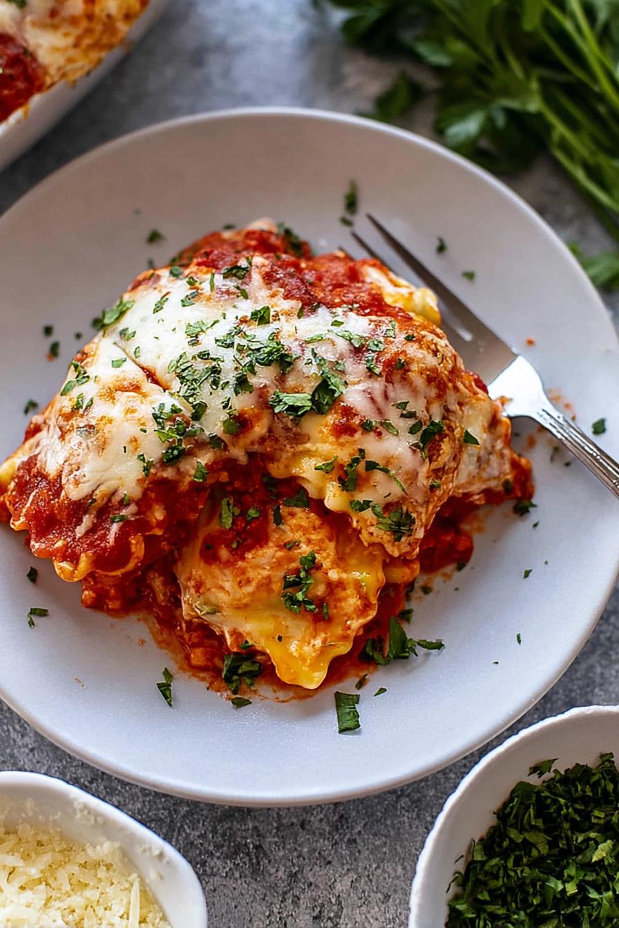 Jumped straight to cooking onions low and slow, coaxing out the natural sweetness. No rush, patience pays off in steady peeling layers of aroma. Garlic added right at peak softness, makes whole pan sigh. Ground chicken swapped in because turkey sometimes dry; combined with chipotle tomato sauce for smoky edge rather than classic marinara sweetness. Choosing fontina cheese ups the ante flavor-wise, melts with smoother bite and nutty twist. Pasta cooking monitored not by clock but by sight—floating ravioli indicating done-ness reliably. Assembly follows logic for even moisture distribution, no soggy bottom drama. Foil tenting technique stops burning or drying cheese. Broil step finishes with irresistible golden crust, done when bubbling sounds intensify. Let rest or ruin the slice. Parmesan optional but never wasted.