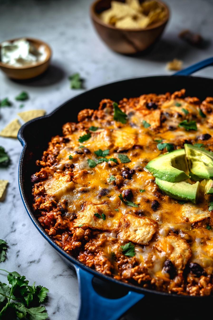 Ground turkey holds up better if not over-stirred during cooking. Olive oil offers clean flavor but avocado or canola oil work if needed. Yellow onion preferred—not too sweet like Vidalia, not pungent like red. Fresh garlic best for aroma; garlic powder substitute if short on time—add with seasoning instead of with onions. Chunky salsa should have texture; smooth salsa dulls bite. Cream of mushroom soup swapped from tomato soup to lend earthier undertone; cream of chicken or celery also possible if allergies or taste preferences. Black beans replace kidney beans for meatiness and texture variety—both canned drain and rinse to reduce sodium and prevent gummy beans. Tortilla strips home-baked elevate texture; skip if time-crunched and serve with soft flour or corn tortillas instead. Monterey jack cheese melts smoothly; cheddar or pepper jack adds sharper flavor. Customize toppings with avocado, sour cream, or jalapeños for spice. Lime brightens—never skip if available. Always taste before final salt adjustments, canned products vary widely.