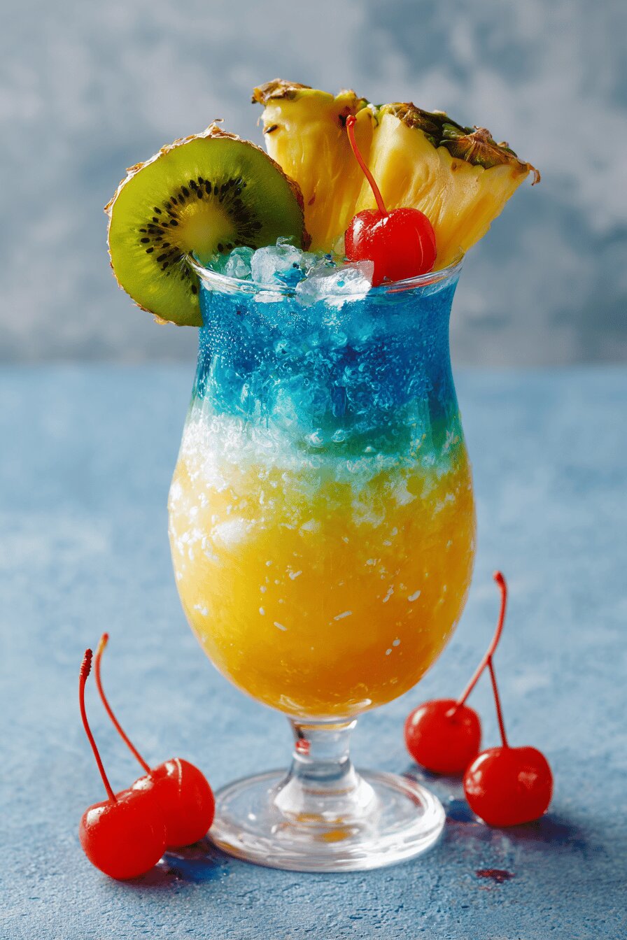 A bright tropical cocktail mixing freshly squeezed orange and pineapple juice with aged gold rum and creamy coconut milk, layered under vibrant blue curaçao. Garnished with tangy kiwi and maraschino cherries. Quick shake, slow build. Ice crushed not cubed—textured ice changes everything.