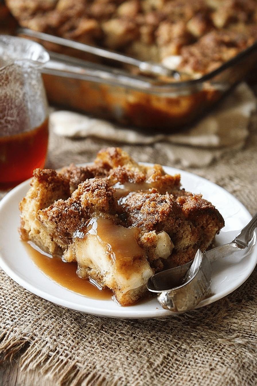 Custard soaked cubed ciabatta, baked low and slow with cinnamon and maple syrup. Brown sugar topping caramelizes to a crackly crust. Vanilla swapped for cardamom. Half-and-half replaces cream to cut richness. Eggs reduced slightly. Sauce uses coconut milk and a splash of bourbon for warmth. Soak overnight for deep flavor penetration. Visual cues guide doneness—wiggly center, golden edges. Avoid soggy, dense texture by draining excess custard before baking. Sauce thickens on cooling, pouring while warm. Serve just cooled so sauce seeps in but pudding retains structure.