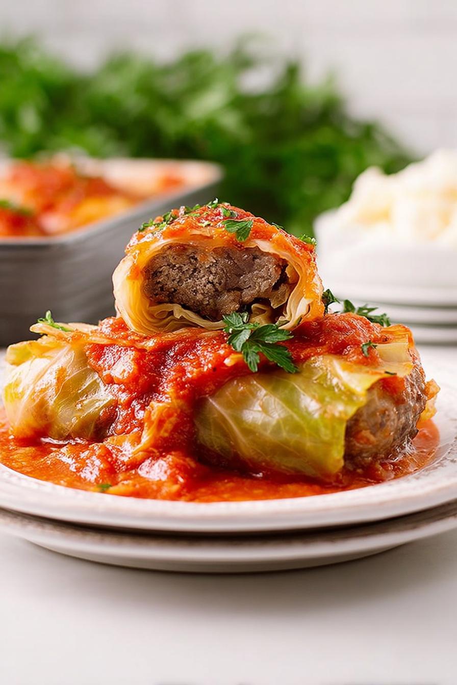 Preheat accurately—oven temps vary; a quick oven thermometer is priceless. Boiling cabbage in salted water softens leaves quickly; watch leaves for visual dulling, edges curling, and test pliability by folding—should bend without cracks or holes. Removing stalks reduces bulk; use a paring knife for precision. Mix filling with care; compressing too much makes dense rolls; light but thorough mix keeps filling tender. Portion size depends on leaf size but consistency in filling size helps even cooking. Rolling technique—roll from stalk end toward edge, tuck sides mid-roll; think tight. Place seam down for stability so rolls don’t unravel. Sauce made separately hits all flavor corners; mix well so sugar dissolves, acidity blends. Pour sauce evenly, don’t overfill; too much liquid means soggy rolls. Cover dish with foil to trap steam but secure to avoid leakages. Baking time varies by oven and roll size; bubbles and slight browning on edges cue doneness. Removing foil late crisps the top and intensifies flavor. Resting after baking firms rolls and melds flavors; slice gently with a sharp knife to keep form intact. If sauce too thin, simmer on stove uncovered briefly. Plate warm, sauce spooned generously over. Labels like ‘cook 90 minutes’ are guides; learn to read your oven and trust tactile and olfactory hints.