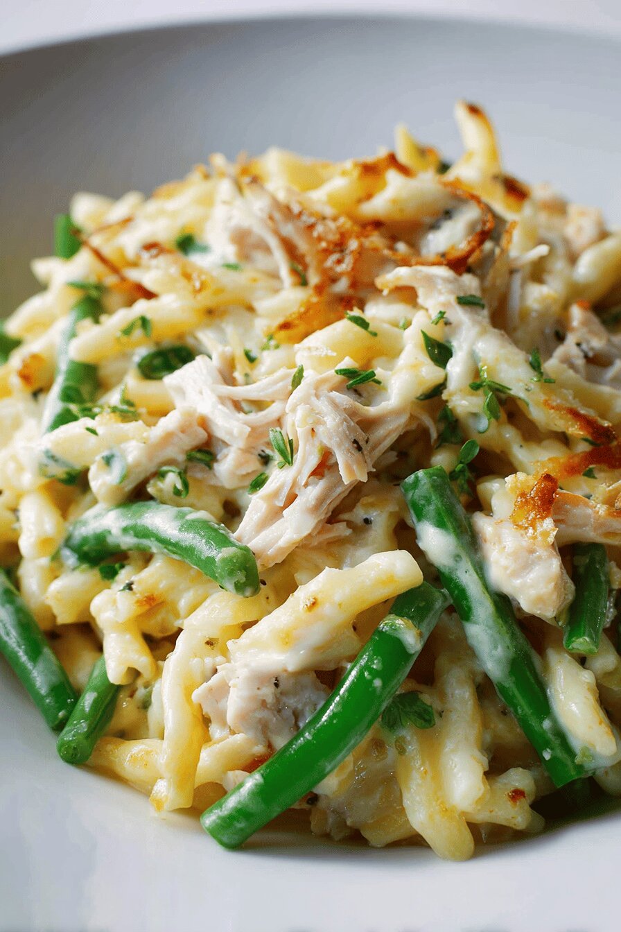 Parsnips instead of carrots – a sweeter, earthier root. Frozen green beans instead of peas – extra snap after simmering, less mush. Butter and flour ratio slightly adjusted; thicker roux for better hold of sauce. Fresh thyme over estragon for a different aromatic twist. Lemon zest adds a citrus edge that contrasts richness. Farfalle chosen for its shape, but any short kind will do. Stock preferably homemade or low sodium for control. Chicken shredded – leftovers or store-bought. Salt and pepper to taste - start low and build. No nuts, no dairy aside from butter, no eggs anywhere in this dish.