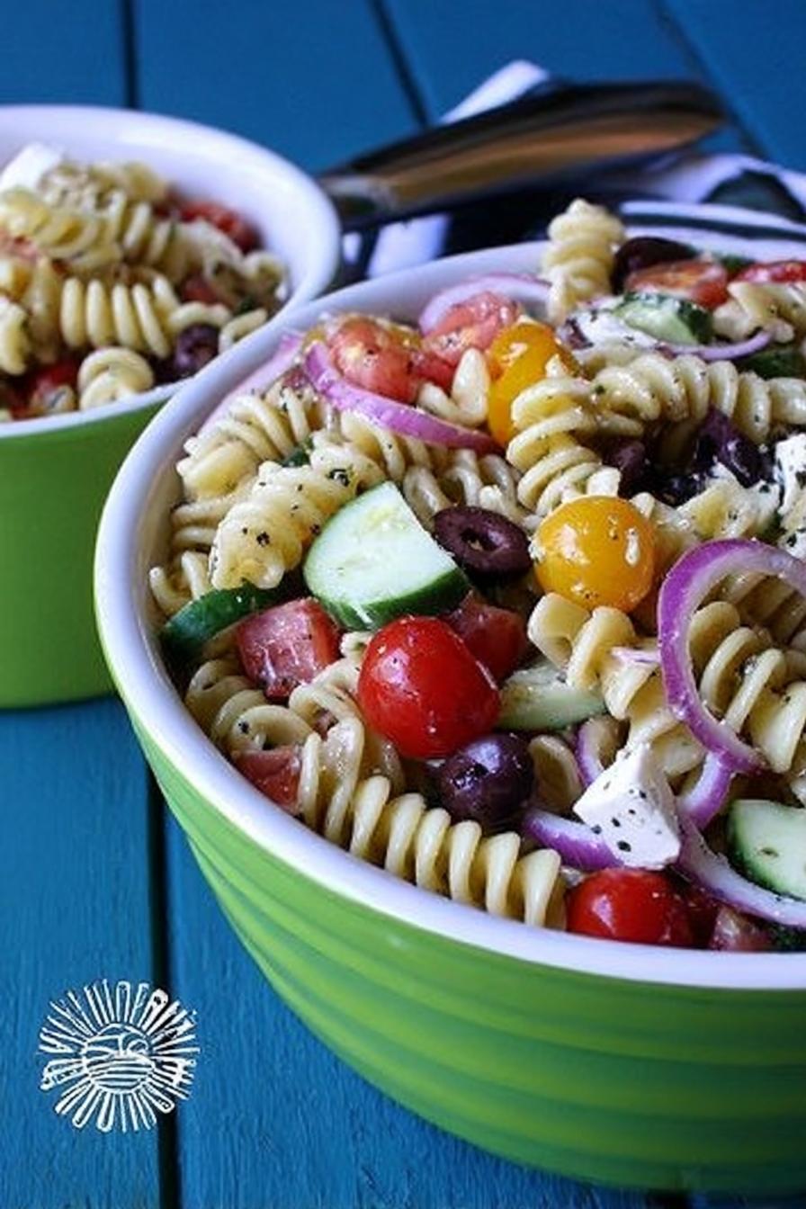 Pasta cooked tender but firm tossed with fresh veggies and bold Mediterranean flavors. Chill but hold dressing for later to keep bite alive. Swapped out feta and cucumber for goat cheese and roasted red peppers. Added fresh oregano for bite. Simple, reliable, handles the fridge’s mood swings well.