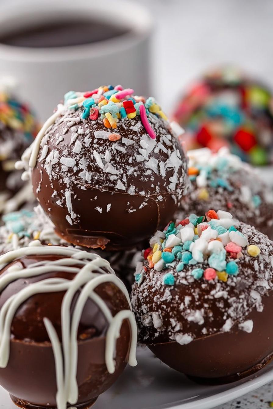 Melt dark chocolate at medium-low heat in short bursts. Brush 1¾ teaspoons into silicone molds — swirl up sides to build walls. Freeze 6-12 minutes until firm. Repeat with thinner chocolate layer for sturdiness — do one mold at a time; chocolate seizes rapidly. Half spheres get filled with spiced cocoa mix plus dried hibiscus petals instead of marshmallows. Seal halves with melted white chocolate piped around edges; set sprinkle rim while tacky. Once cold, drizzle with melted matcha white chocolate for contrast. Serve by pouring hot oat milk over bombs in mugs — bubbles and cracking shells signal readiness. Works well with dark or vegan chocolate substitutes. Avoid overheating or grainy lumps.