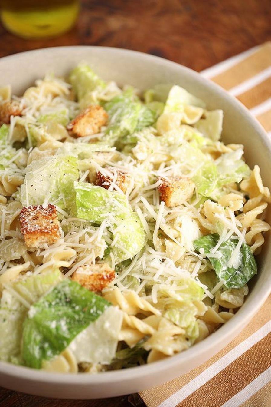 A riff on the classic Caesar salad with rigatoni pasta replacing traditional romaine base bulk. Pasta cooked al dente, cooled quickly to stop carryover cooking. Crisp iceberg takes over hearts of romaine for crunch and fresh bite. Creamy buttermilk dressing swapped for a tangier Greek yogurt Caesar dressing with anchovy paste for punch. Parmesan swapped for pecorino. Quick sautéed garlic croutons add a toasty aroma and crunch, made ahead to save time. Black pepper ground fresh at service. Salt adjusted gradually. Simple but bold flavors working in layers. Use leftover pasta or salad greens, rescue wilting greens here. Visual cues dominate.