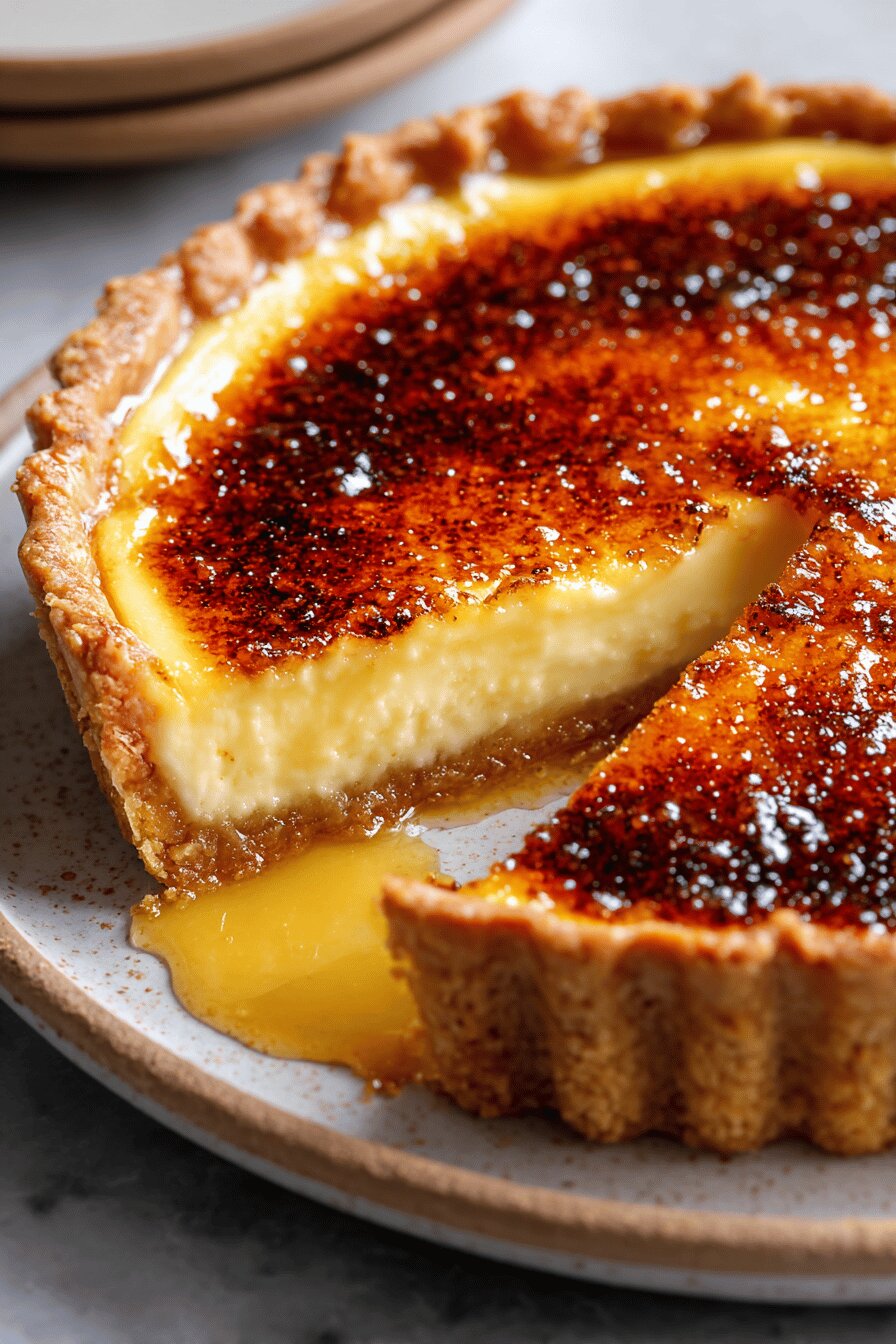 Flan, custard tart. Creamy, dense, with a crackling toasted crown. Classic vanilla meets tropical coconut milk twist. Browning butter for the crust brings nutty depth. Cinnamon in the dough adds subtle warmth, unexpected but not loud. Long infusions and constant stirring, no lumps allowed. Set custard thick but yielding, wobbling just a little when done. Chilling crucial — flavors settle, texture solidifies. Broiling scorches sugary surface to uneven caramel char. Dark spots, bits burnt. Imperfect, rustic, appealing. Slice thick. Meal-dessert crossover. French inspired, tropical infused.