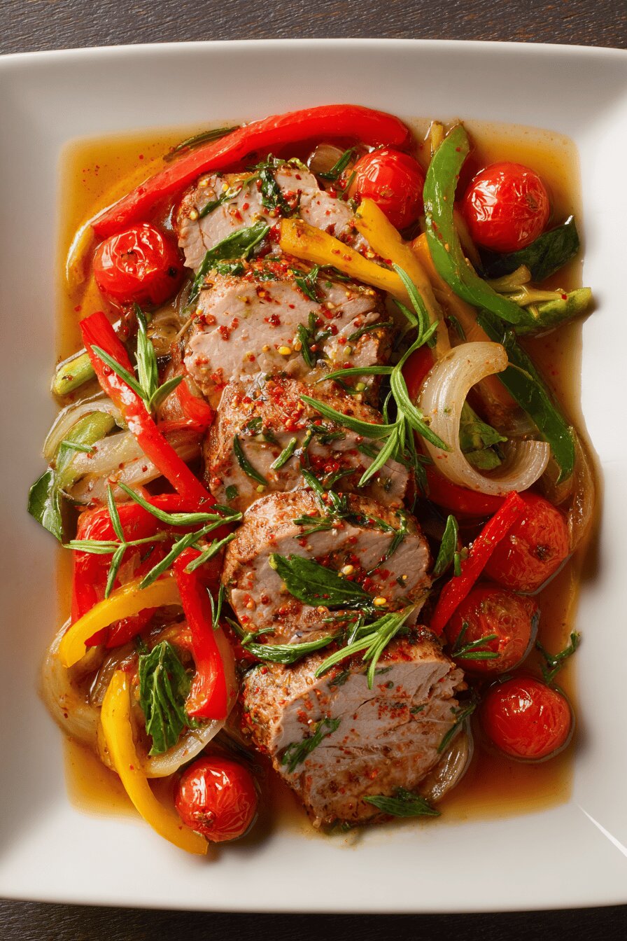 A roasted veal loin with vibrant peppers, fresh sage, and tangy lemon. Uses oregano instead of sage for herbal depth and adds smoked paprika for a subtle smoky warmth. Lemon zest brightens the oil-seared meat, while reduced chicken stock sauce balances acidity. Peppers and shallots caramelize slowly. Cherry tomatoes burst juice near the end. Adjust roast timing by feel not clock for consistent pink interior. Pan sauce strained to avoid grit. Allergen free without dairy, nuts or eggs, suitable for delicate diets.