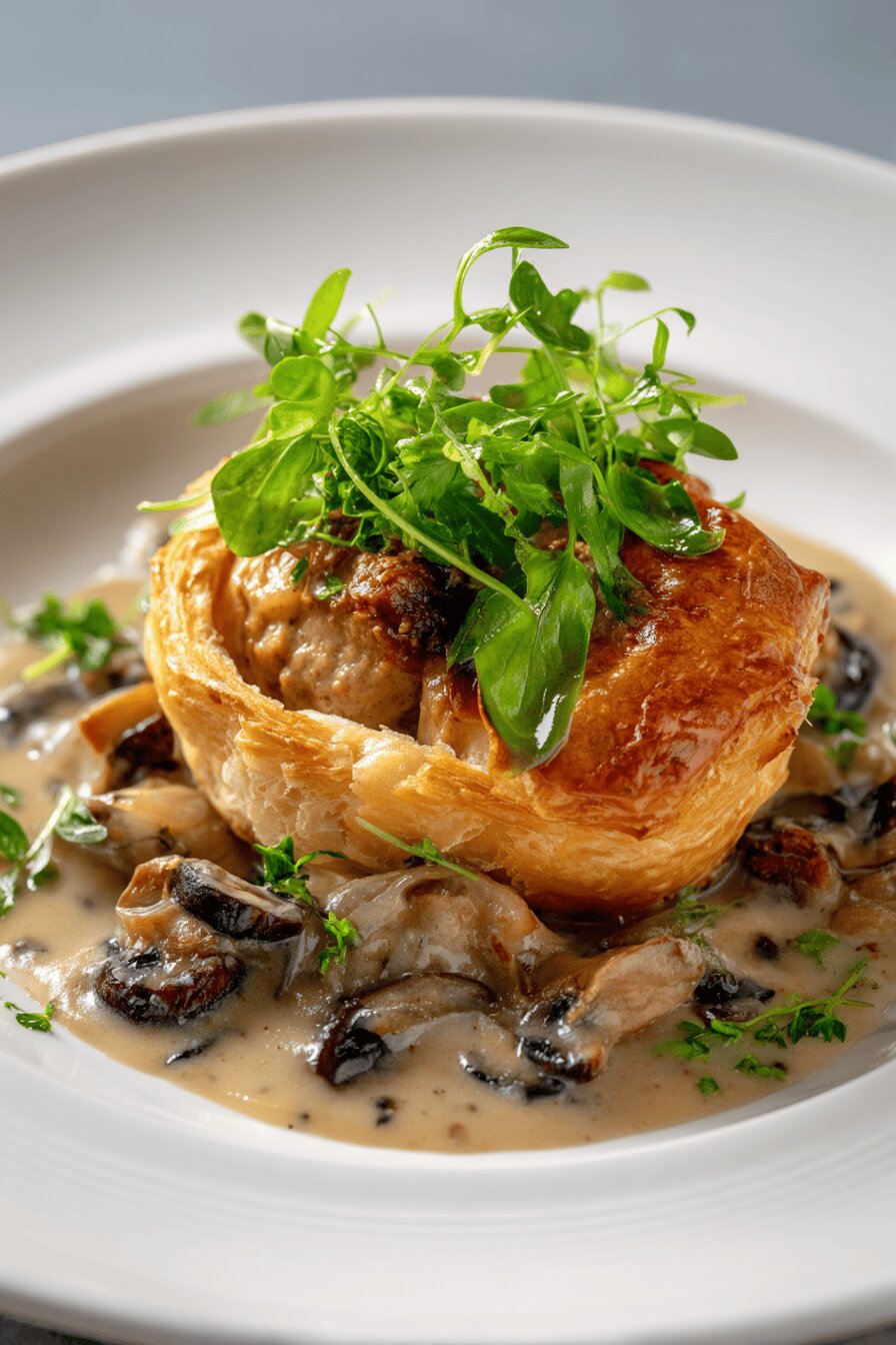 Veal sweetbreads soaked, blanched, then browned in butter; finished with a rich reduced sauce of white wine and stock. Mixed wild mushrooms softened with shallots and garlic plus fresh tomato for acidity. Encased in crisp puff pastry with egg wash gloss. Garnished with peppery watercress for contrast. Balance of textures—creamy sweetbreads, tender fungi, crispy shell. Substitutions: chicken broth if no poultry stock, puff pastry store-bought or homemade. Timing based on visual cues rather than clocks—golden pastry, translucent mushrooms, sauce coating spoon. Avoid overcooking sweetbreads; they toughen fast. Gentle simmer avoids breaking sauce or drying protein. Practical and flavorful.