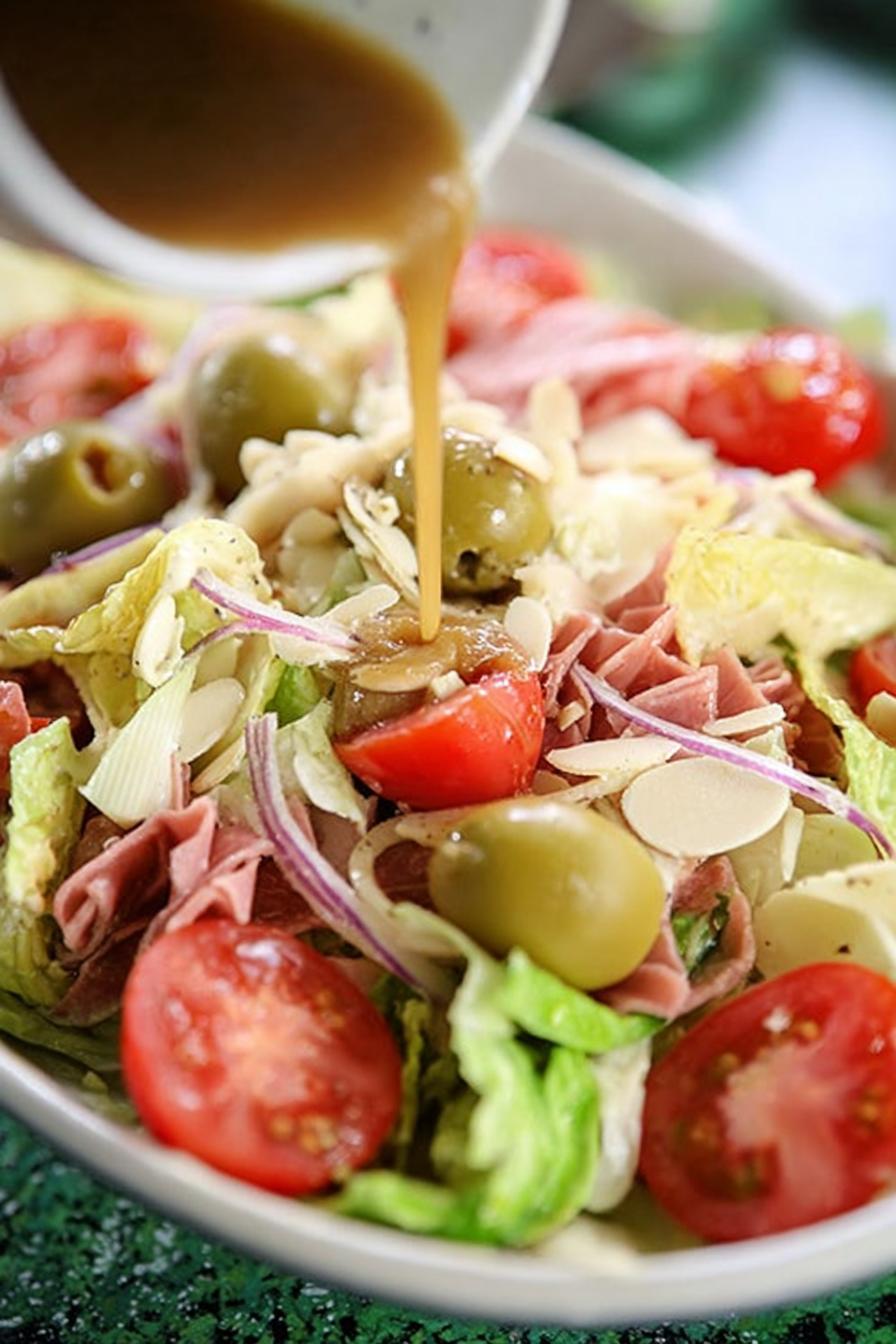 Olive oil must be good quality, no bitterness. Garlic minced finely so no harsh chunks—mellow cooking off in dressing happens if prepared earlier. Worcestershire sauce adds umami depth; tamari or soy sauce okay if needed but balance salt carefully. Red wine vinegar provides sharp acid; apple cider vinegar milder alternative. Lemon juice last, or acid can overpower. Romaine—choose firm, fresh leaves or pick Boston for softer. Provolone swaps nicely for mozzarella or mild cheddar; chunked pieces avoid slick texture. Ham’s replaced with smoked turkey for leaner protein; roast chicken breasts can stand in; they lack the smoke, add a small pinch of smoked paprika for smoky flavor. Capers instead of artichokes—assertive, salty tang cutting through richness. Green olives chopped to avoid big briny bombs; pitted always. Romano cheese grated fresh yields sharper, nuttier layers. Salt at end—too early and leaves mellow or get soggy. Fridge chill recommended if prepping in advance but bring to cool room temp before serving.
