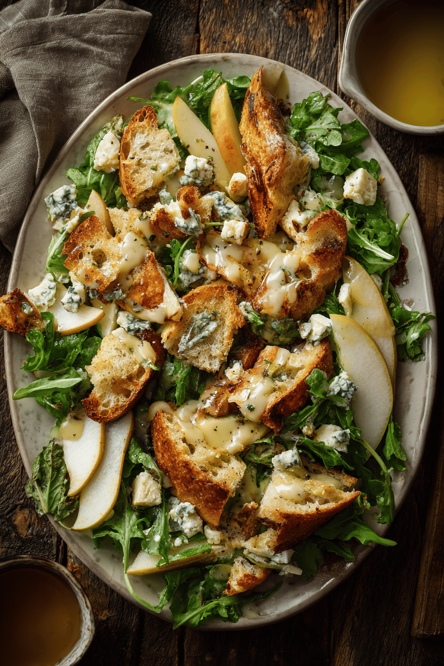 Salad with warm melted blue cheese on crusty bread, fresh greens, and pear slices. Vinaigrette tangy with white wine vinegar and honey, balanced with garlic and olive oil. Cheese swap with goat cheese or Camembert works. Bread crisped under broiler, cheese bubbling and golden. Pear adds fresh, juicy contrast. Visual cues mark readiness rather than strict timing. Quick, fresh, balanced. Vegetarian, no nuts or eggs.