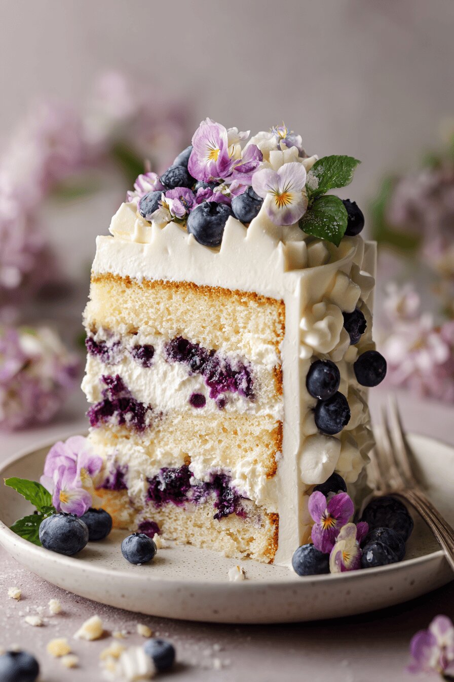 Flour sifted ensures no lumps and even mixing with leaveners. Baking powder and soda combo gives lift, texture. Buttermilk’s acidity reacts with soda for tender crumb. Oil keeps cake moist longer than butter. Extra white egg whites increase lift, create airy crumb but too much dryness hurts. Blueberries dusted with flour stay suspended, don’t sink during bake. Corn syrup in modeling paste stops it from cracking, adding pliability. Softened, not melted, butter in buttercream keeps consistency; too cold butter causes lumps, too warm will soften frosting excessively. Use gel colors for good pigment without changing texture or flavor. Blueberry jam adds intense fruit sweetness but can be swapped for raspberry for tartness. Fresh flowers optional but must be clean and pesticide-free.