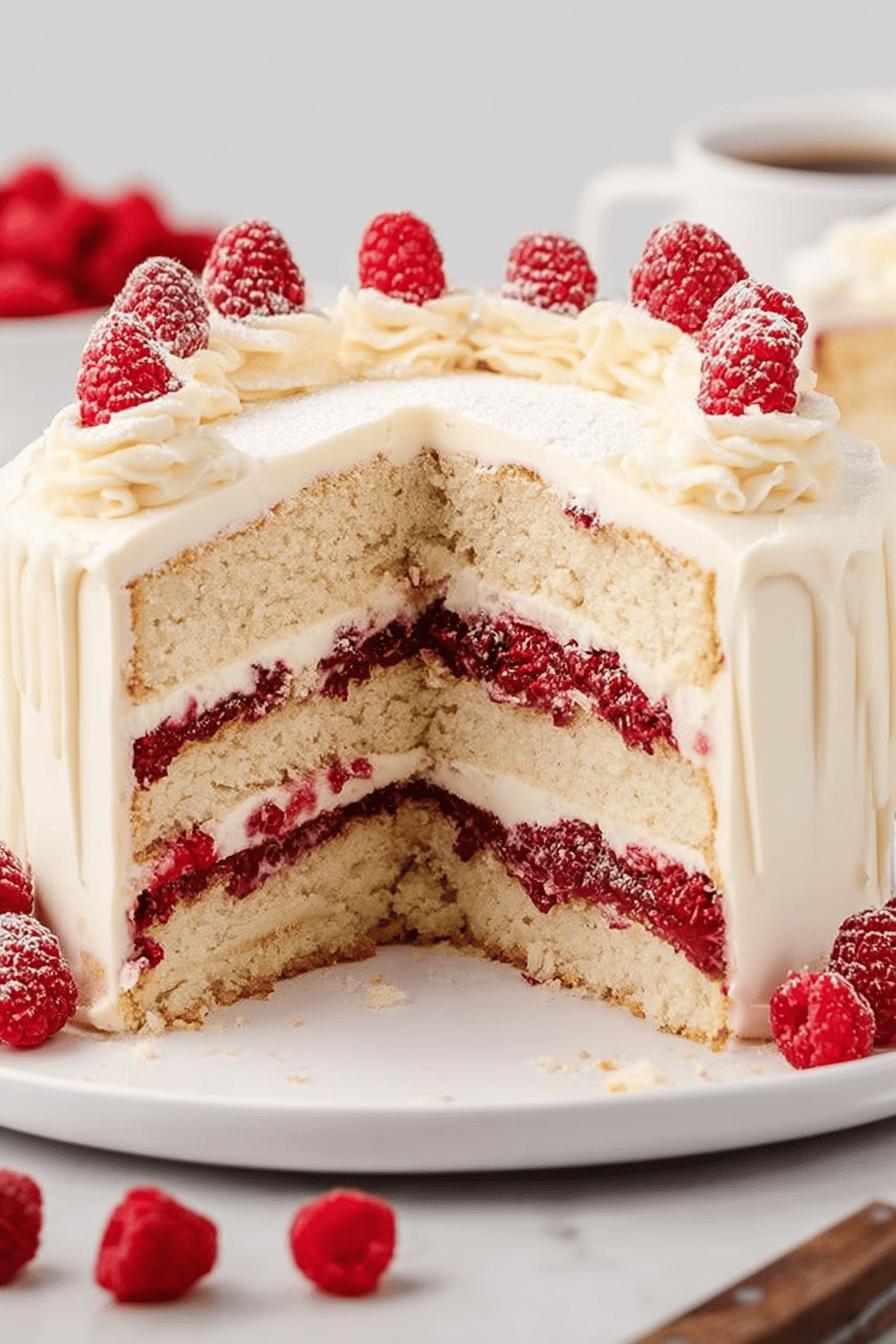 Frozen raspberries—always use frozen, fresh can water down filling. Granulated sugar controls sweetness and thickening. Lime juice replaces lemon for brighter acidity, optional. Arrowroot powder gives a clear, shiny glaze, cornstarch can replace but slurry must be cold to prevent clumps. White cake mix and white chocolate pudding powder combine convenience and flavor lift. Coconut oil melts into smooth batter, offers subtle aroma; vanilla extract must be clear for white cake to stay pure color. For frosting use good-quality white chocolate (baking bar) for better melting and clean flavor—chips do not always melt smooth. Cream cheese addition cuts sweetness and adds stability, especially important with white chocolate’s heaviness. Heavy cream incorporated for spreadability. Fresh raspberries and lemon zest garnish brighten cake and tone down richness. For piping border, reserve frosting to contain filling, minimizes bleeding—small step with big effect.