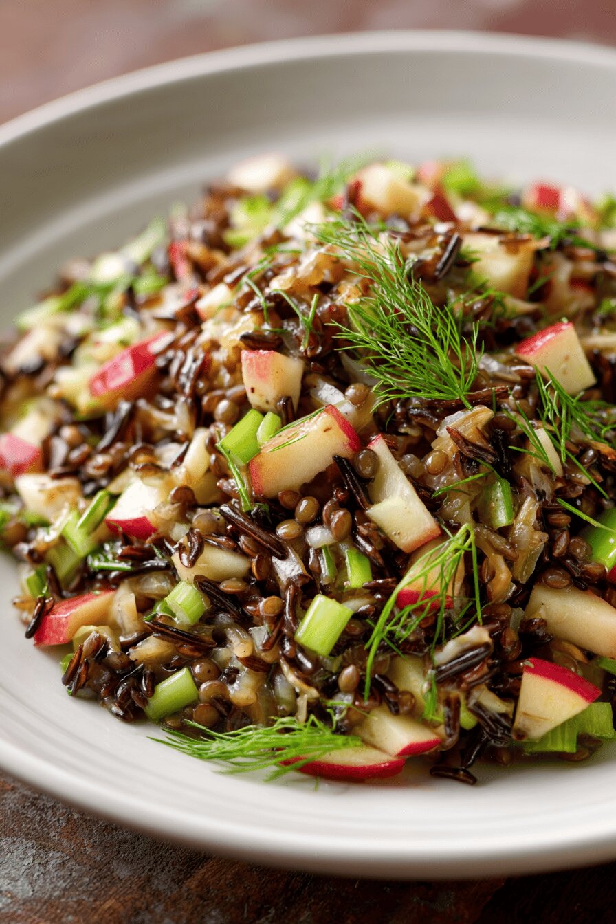 Wild rice is grittier than brown or white. Rinse well to remove dust, cook like pasta—gentle simmer, covered but vented so steam escapes but heat doesn’t drop drastically. Fennel is fibrous—thin slicing cuts bite, releases aroma, mutes any bitterness. Swap apples with pears or crisp quince if seasons call. Lentils here can be replaced with French green or even black beans for a different protein profile, but texture varies a lot—rinse canned lentils well to avoid canned taste. Using sherry vinegar in place of cider vinegar deepens complexity without making acidic bite sharp. Maple syrup softens molasses’ strong flavor and avoids cloying sweetness. Keep fruits and vegetables cold before assembly, ensures crunch and freshness. Celery adds extra crunch and vegetal sharpness very differently than fennel.