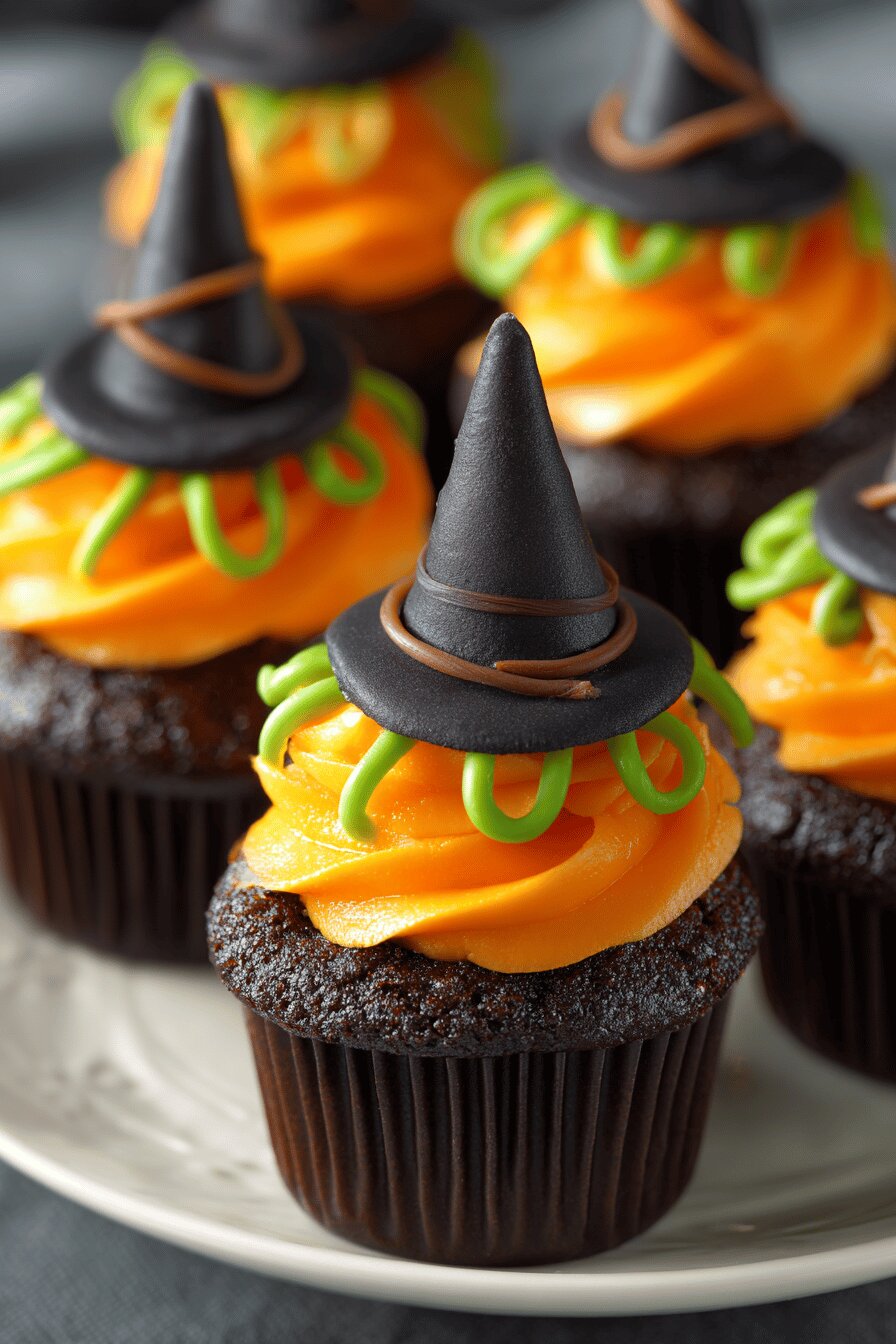 Chocolate cupcakes with orange frosting topped by witch hats made from mini cones coated in dark chocolate. Green and black licorice used for decoration around the hats. Treats have a crisp chocolate shell and bright citrus icing with candy accents. Prep involves baking base cupcakes, making frosting, coating cones, and assembling hats. Slightly chilled before and after assembly for texture. Suitable for vegetarians and free from nuts.