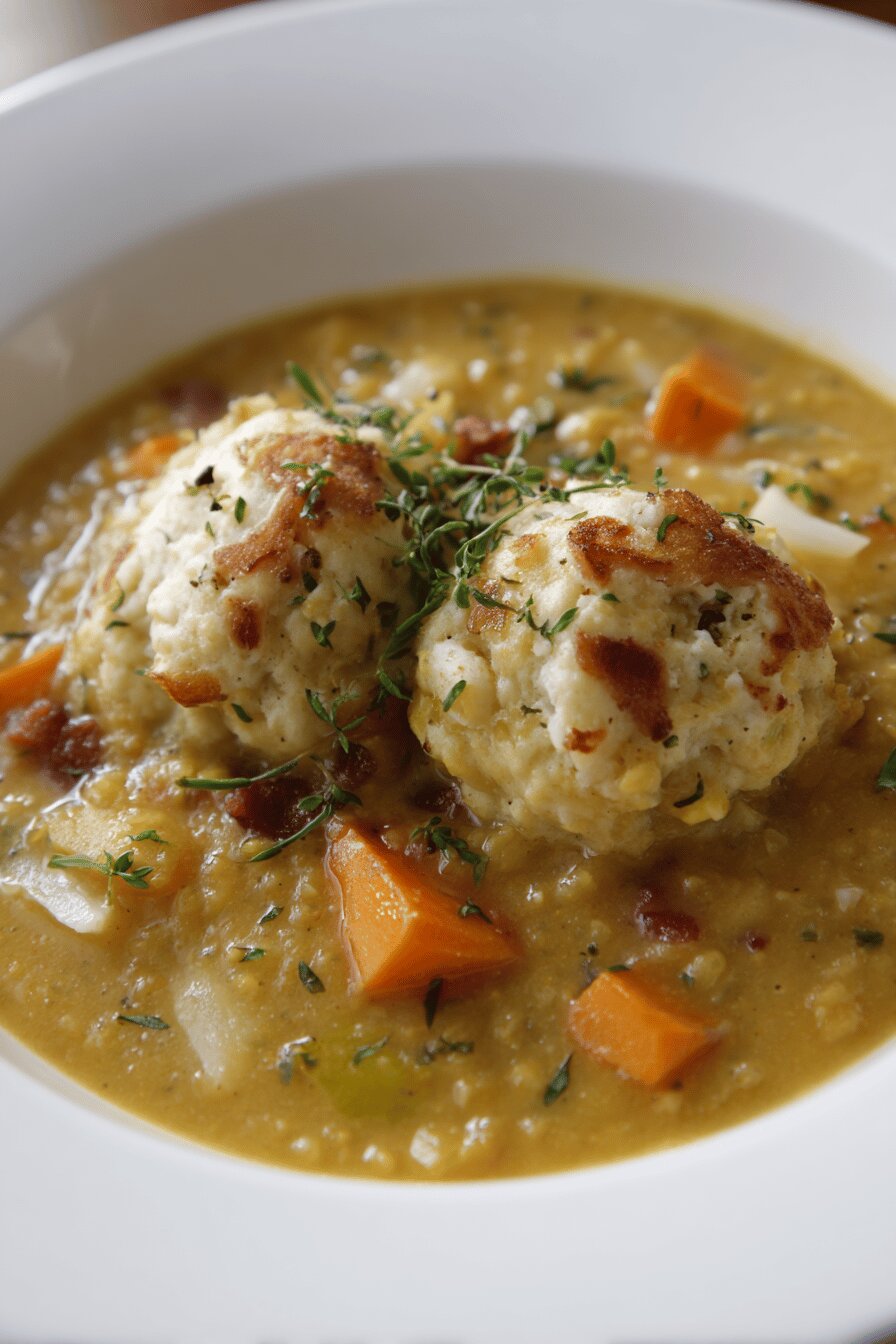 A rustic yellow split pea soup enriched with smoky pancetta and root vegetables, slow-simmered until hearty and creamy. Topped with tender cheese dumplings studded with sharp aged cheddar. The recipe swaps rutabaga for parsnip, lardons for diced pancetta for a subtler, cleaner pork flavor. The dumplings swap butter for olive oil and milk for cream, lending silkier texture. Simmering times adjusted slightly. Dicing the veggies uniformly ensures even cooking. Dumplings dropped gently, cooked until set with slight crumble on a tester. Small practical tips help troubleshoot and get consistent results.