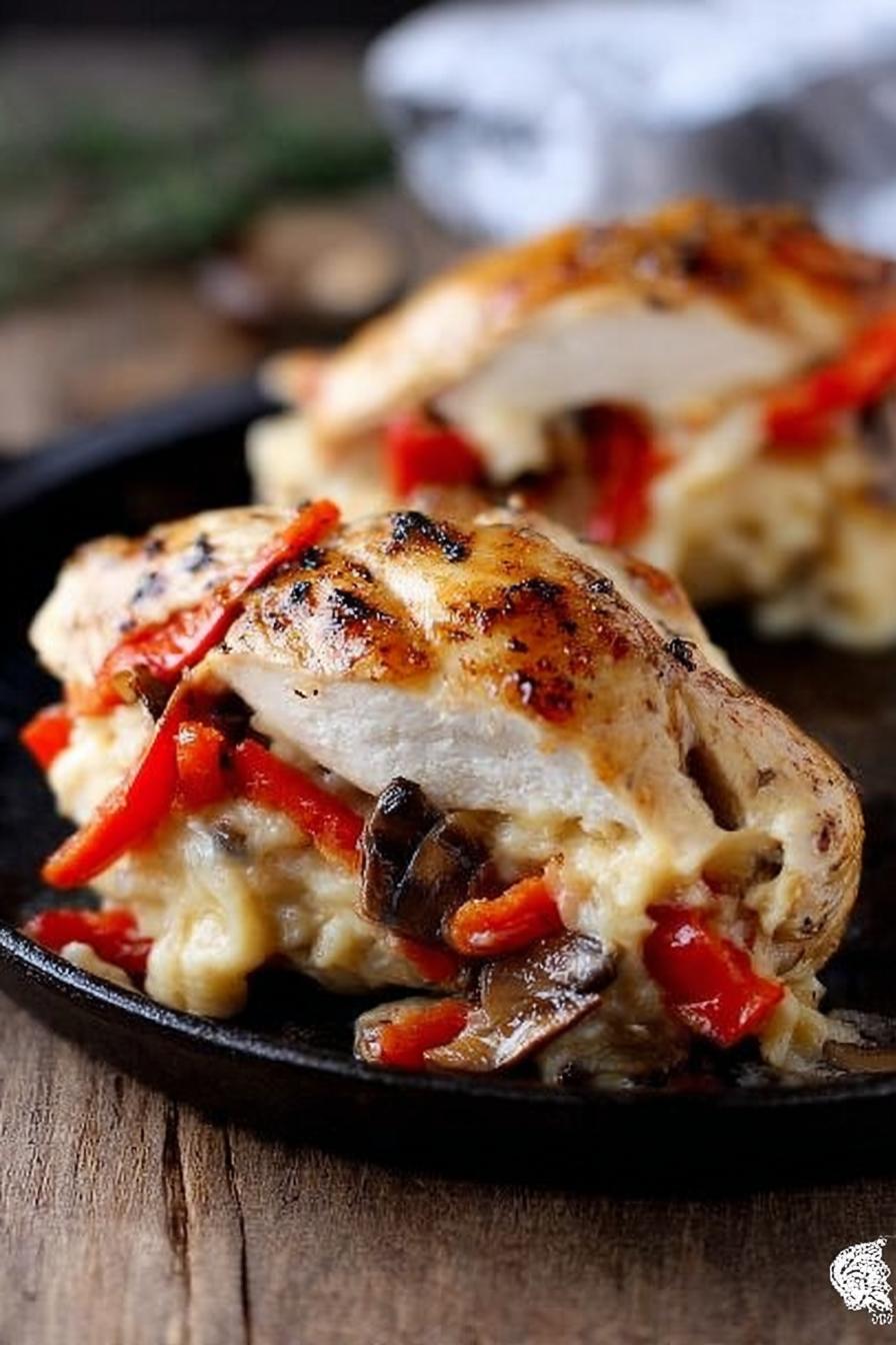 Greek yogurt binds stuffing and chicken coating, adding moisture and acidity; avoid watery yogurt—use thick, strained variety. Mozzarella chosen for melt and stretch but can swap for ricotta or even crumbly feta if softer texture desired—adjust moisture accordingly. Shallots replace onions for a gentler aromatics layer, balancing sweetness and pungency; bell peppers add color and crunch, but swap with zucchini or spinach if needed. Cremini mushrooms give earthy depth; if unavailable, button mushrooms or chopped eggplants work. Fresh garlic is essential, minced finely to avoid bitter bursts in the pan. Butter is crucial, not just for flavor but to help sauté without burning, allowing vegetables to soften and caramelize gently. Nonstick spray or parchment prevents sticking during bake—avoids frustrating cleanup and tearing tender chicken. Salt and pepper must be split between stuffing, coating, and seasoning veggies—layering flavors rather than piling on.