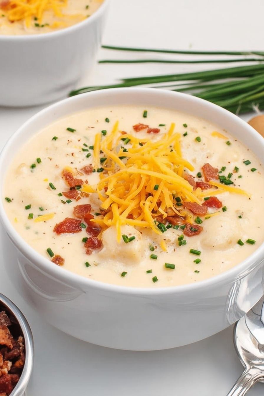 Chunky potato chowder built slow in the crockpot. Starts with crisped smoky pancetta instead of bacon—stronger flavor. Onion sweats in rendered pork fat until glassy, layering base aroma. Yukon gold potatoes replace russets for creamier texture. Chicken broth swapped with vegetable stock for subtle sweetness. Thickened mid-cook with roux made from drippings and flour, blended into heavy cream. Cream cheese joins sour cream and sharp smoked gouda for a tangy, luscious melt. Cheddar held back for garnish. Five and a half hours total cooking. Bacon sprinkled last, retaining crisp. Wispy chives for brightness. Robust, rich, textured. Salt and pepper to taste. Visual cues drive timing; no guessing.
