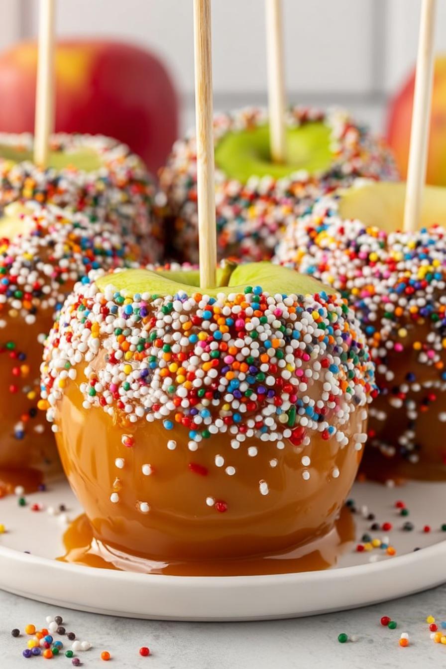 Heating method critical. Medium-low heat ensures caramel melts evenly, stops scorch. Stir constantly—clumps signal fail. If caramel tightens, add same tablespoon water, one at time until gloss returns. Chill apples firm, chill time key—less sliding, clean coat. Dip 3/4 way not full submerge. Tap firmly to shake excess, prevents runs and puddles. Do toppings right after dip before caramel sets up or they won’t stick. Chocolate drizzle only after caramel set—melt chocolate in short bursts at low power, stir often to smooth. Let apples set ideally on room temp—not fridge, condensation wrecks finish. Visual cues trump clocks—caramel glossy, pliant—not runny or dry—that’s your cue. Texture final: crisp apple with chewy, salty-sweet caramel coat. Clean up with warm water soak to ease caramel residue—no scrubbing hell. No shortcuts.