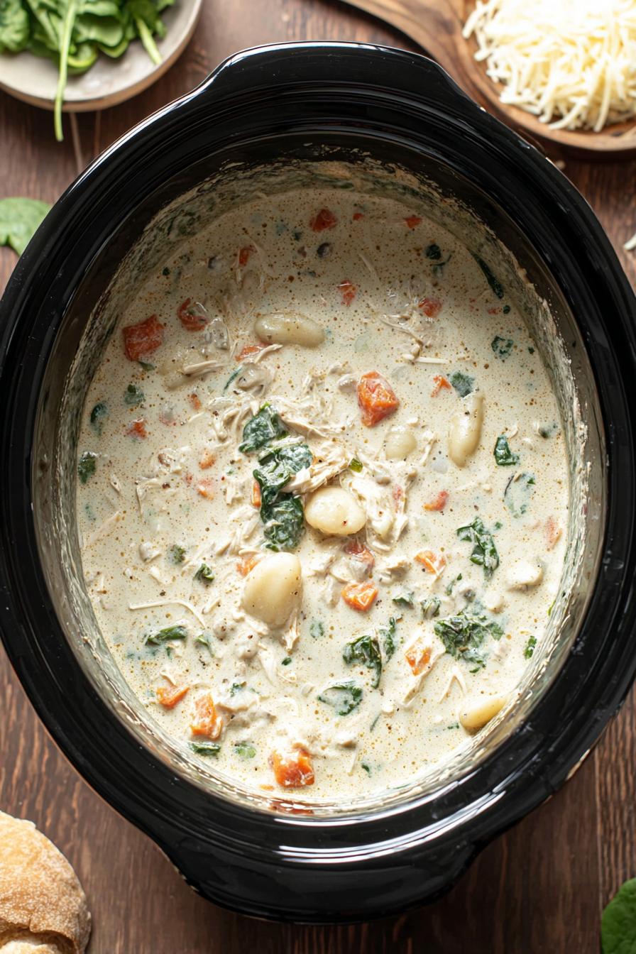 Layering flavors in slow cooker key—vegetables and herbs release at different rates. Gentle stir at start avoids shredding raw chicken prematurely, which would dry it out. Lid tightness crucial for even heat retention. Recognizing when chicken shreds easily means collagen and muscle fibers have broken down properly, ensuring moist bites. Whisking cornstarch with cold half-and-half avoids clumps and gluey texture. Adding gnocchi and spinach near the end prevents gnocchi disintegration and greens turning slimy. Stirring every 10 minutes lets you catch thickness cues, plus prevents settling gnocchi. Pancetta crisps faster than prosciutto due to fat content; watch edges closely to avoid bitterness from burning corners. Serve promptly as soup thickens more as it cools, or thin with broth if needed. Leftovers store well but gnocchi texture softens with time—reheating gently recommended.