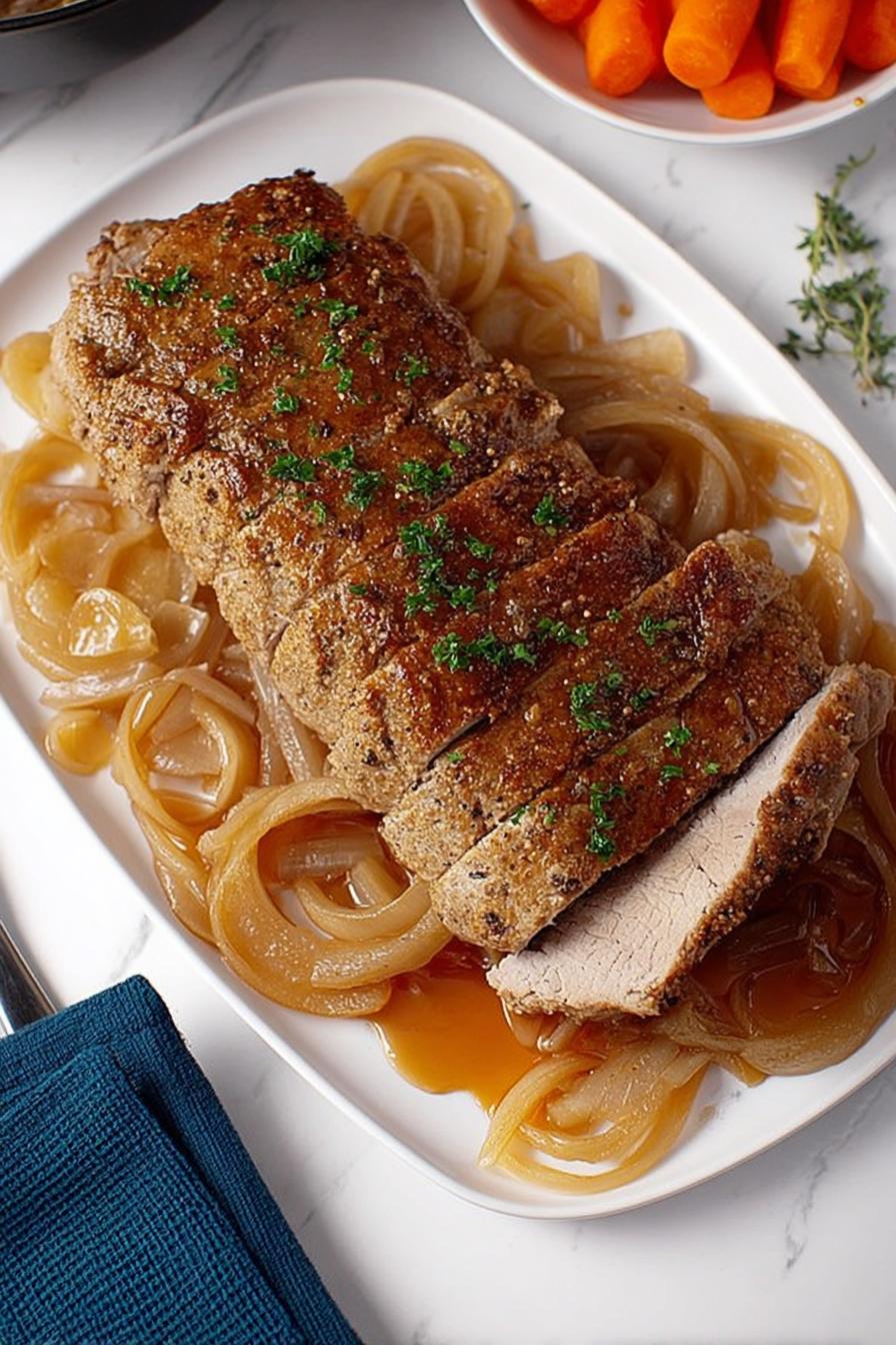 Start with dry pork for good sear - moisture kills crust formation. Spice rub should cover entire roast and sink in slightly for thoughtful penetration. The hot pan sound is your best compass; crisp sizzle means proper chemical reaction, dull noise means no color or stuck juices. Slower sear means wet surface, quick flip, more flavorful edges. Layering onions guards pork from direct liquid bathing—keeps texture delicate. Mix liquids thoroughly before pouring to evenly coat pork and onions. Low setting avoids toughening protein, but check with thermometer, not clock. Just pulling too early leaves it underdone, too late dries it. Resting tented retains heat, stops juices from escaping when slicing. Use fine sieve for smooth gravy, whisk slurry in small increments to avoid clumps. Serve immediately with thick slices to showcase moisture retention. Trust your senses through each step rather than fixed times.