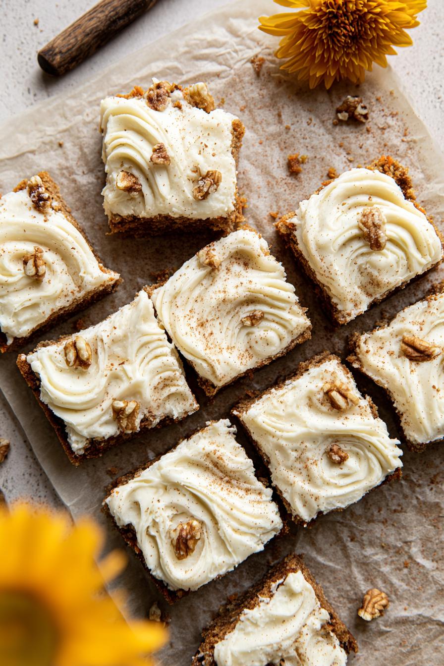 Carrot bars with swapped flour and sweetener, cinnamon and nutmeg for warmth. Butter swapped for oil for moistness, honey replaces brown sugar, with a cream cheese frosting boosted by lemon zest. Baked till light golden, soft inside, not dry. Parchment lift trick, don’t overmix batter. Freshly shredded carrots add texture, walnuts optional but recommended. Visual cues, aromas guide doneness. Frost thick but spreadable; add splash milk if needed. Store covered to keep moist. A carrot bar with a little twist—simple, reliable, textured, flavorful.