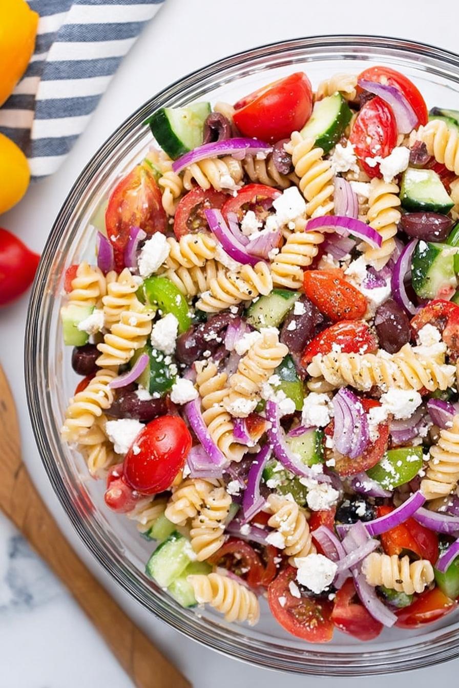 No fluff. Pasta salad that doesn’t get soggy or dull. Layers of crunchy bell peppers, soft tomatoes, pungent red onions, plus salty olives and crumbly goat cheese. Dressing sharp; lemon and vinegar working behind the scenes to cut through fat of olive oil and cheese. Garlic isn’t subtle here—important for punch. Rinsing pasta stops mush. Chilling essential for flavor sync but not over long or pasta breaks down. Use best olive oil you have; lousy oil ruins dressing. Ditch standard feta; goat cheese crumbles smoother yet tart. Mediterranean vibes but flexible ingredient swaps if what you have differs. Kitchen-efficient, no wasted moves, real recipe techniques that work day after day.